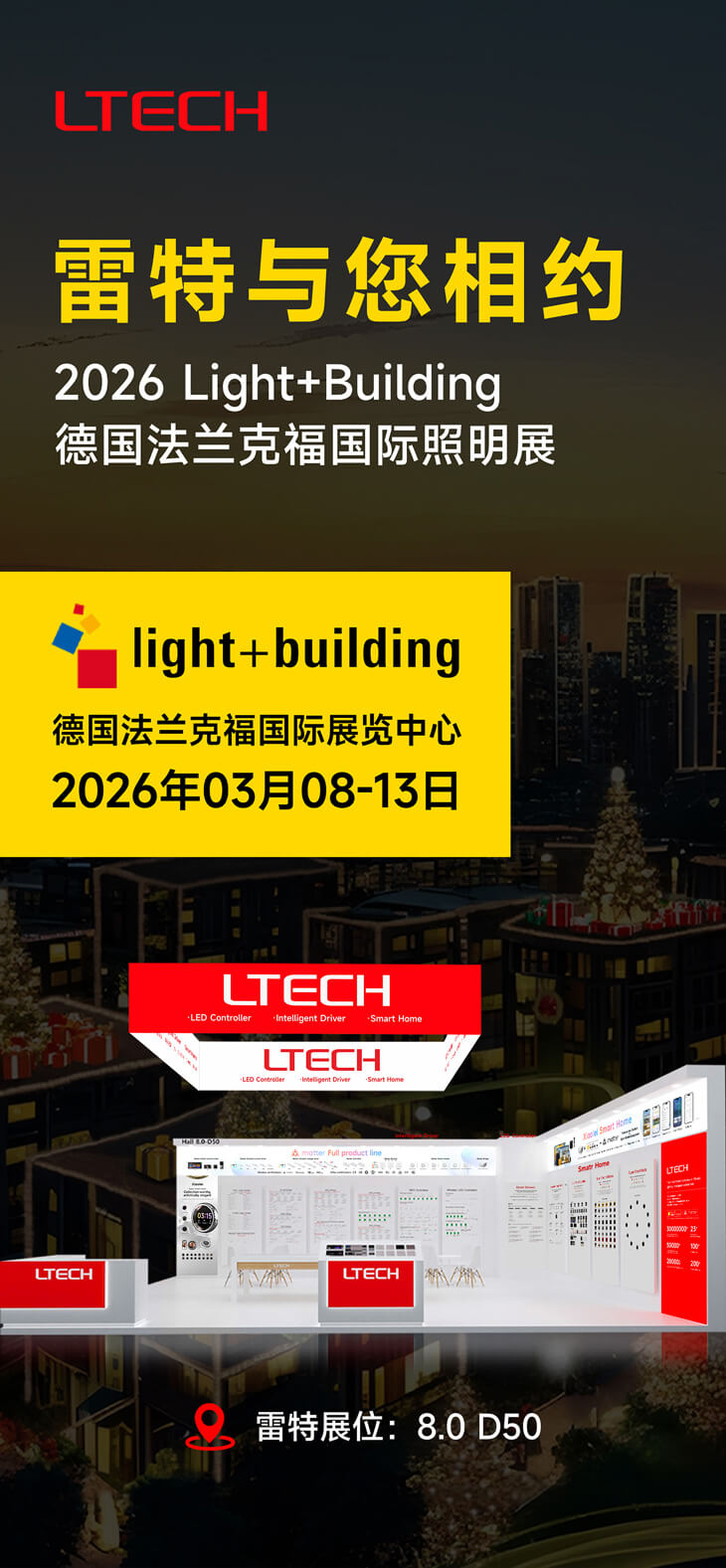深耕智能照明控制领域 23 载的雷特科技,此次将携完整照明智控产品体系与一站式照明智控解决方案亮相,以 “技术创新 + 生态互联” 双轮驱动,在法兰克福展览中心8.0 D50展位,向全球客户展示品牌实力。
