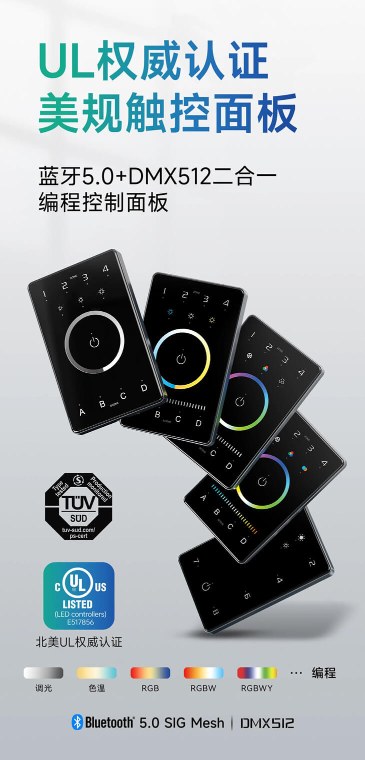 支持调光/色温/RGB/RGBW/RGBWY/编程
