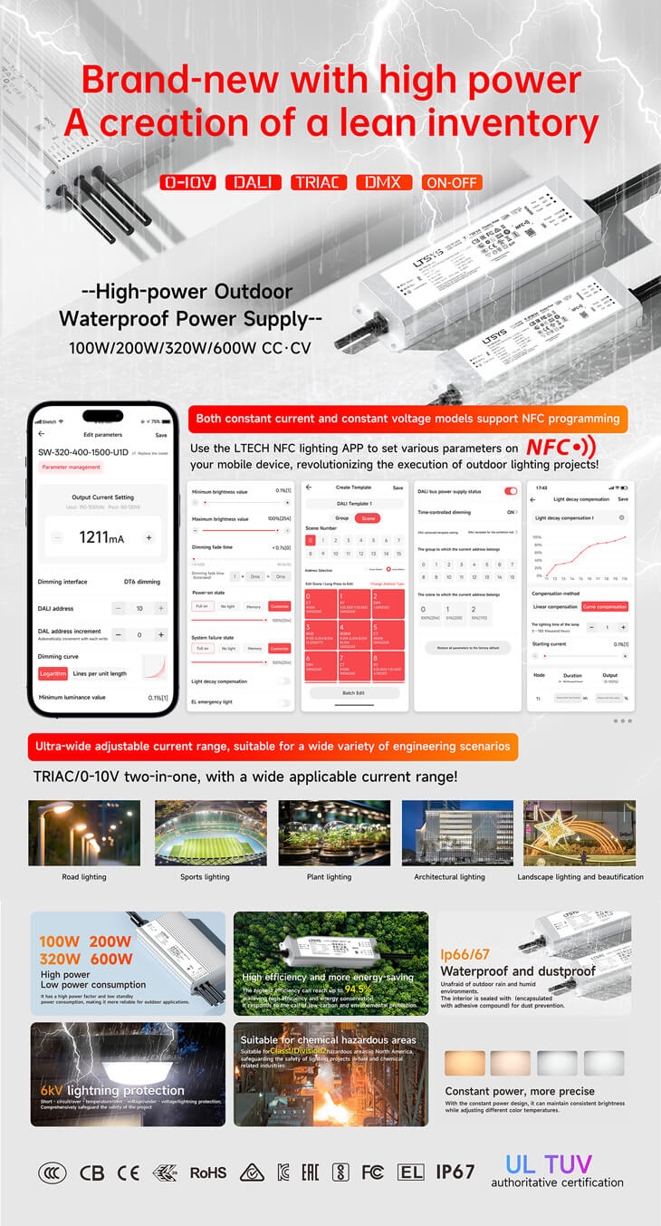 Empowered by LTECH intelligent driver technology,it integrates multiple specification requirements of outdoor waterproof Driver into one product.The power covers 100-600W supports seamless switching between 0-10V and triac dual protocols is suitable for Class I,Division 2 hazardous locations in North America,safeguarding the lighting engineering safety of industries,such as fuel and chemical.With the support of NFC near-field programming whether it is large-scale brightening of commercial complexes or long-term lighting of bridges and tunnels efficient and safe implementation can be achieved.