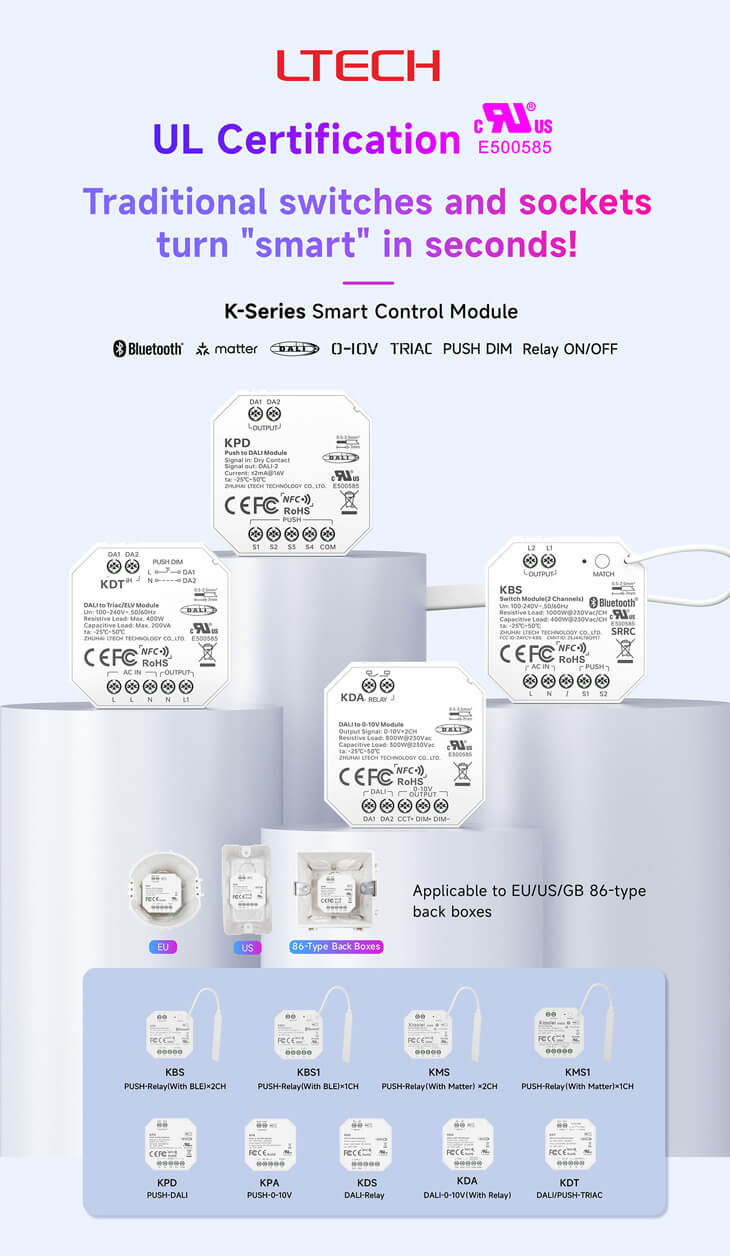 The K Series Intelligent Control Module has passed UL certification is compatible with US/EU/Chinese standard junction boxes features a compact design that enables intelligent retrofit of traditional switches,when placed in the junction box,supports four major wired protocols including DALI, DMX, 0-10V, and Triac, as well as Bluetooth 5.0 wireless protocol and connects to open ecosystems such as Apple Home and Matter.It also allows traditional switches and reset switches to achieve dimmingand device control.