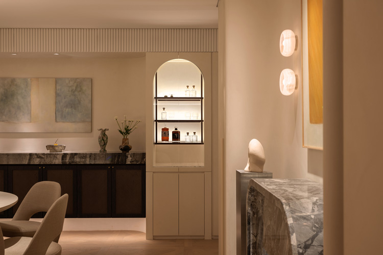 Moving beyond clichéd trends, the designer masterfully integrated the lighting with materials like natural stone, artisanal paint, and parquet flooring. From the living room's skyline-view accent lighting, to the study's soft daylight ambiance, and the dining area's warm atmospheric glow – each play of light and shadow meticulously complements the character of its space.