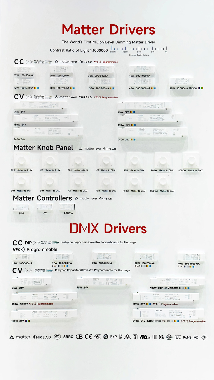 重磅推出Matter控制器,各类大型灯光项目皆可以实现 “跨品牌协同”;高低压防水控制器、大功率户外防水电源,支持NFC近场编程,轻松驾驭楼宇亮化、节日灯饰等复杂场景;K系列智能控制模块,让传统开关插座轻松变智能;以及有线+无线二合一智能旋钮、DMX512+蓝牙2合1美规触控编程面板及智控面板等,轻松打通有线及无线控制方案。