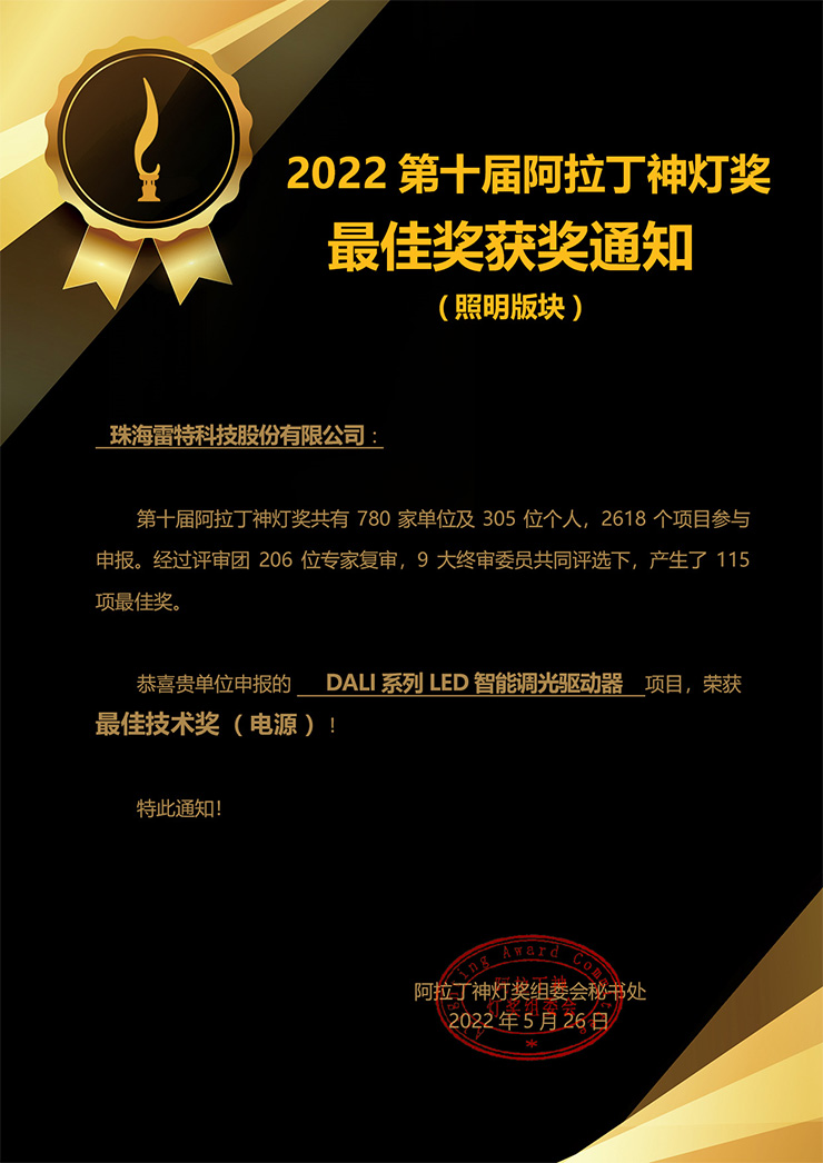 雷特作为深耕照明行业20年之久的中国企业,不仅一直走在国内LED照明控制技术前沿,是全球LED照明控制系统实力厂商之一。始终坚持以科技创新为核心,在智能照明领域不断推陈出新。在第十届阿拉丁神灯奖评选中,雷特DALI系列智能调光电源,更是成为了最佳技术奖项中唯一揽奖的智能电源。