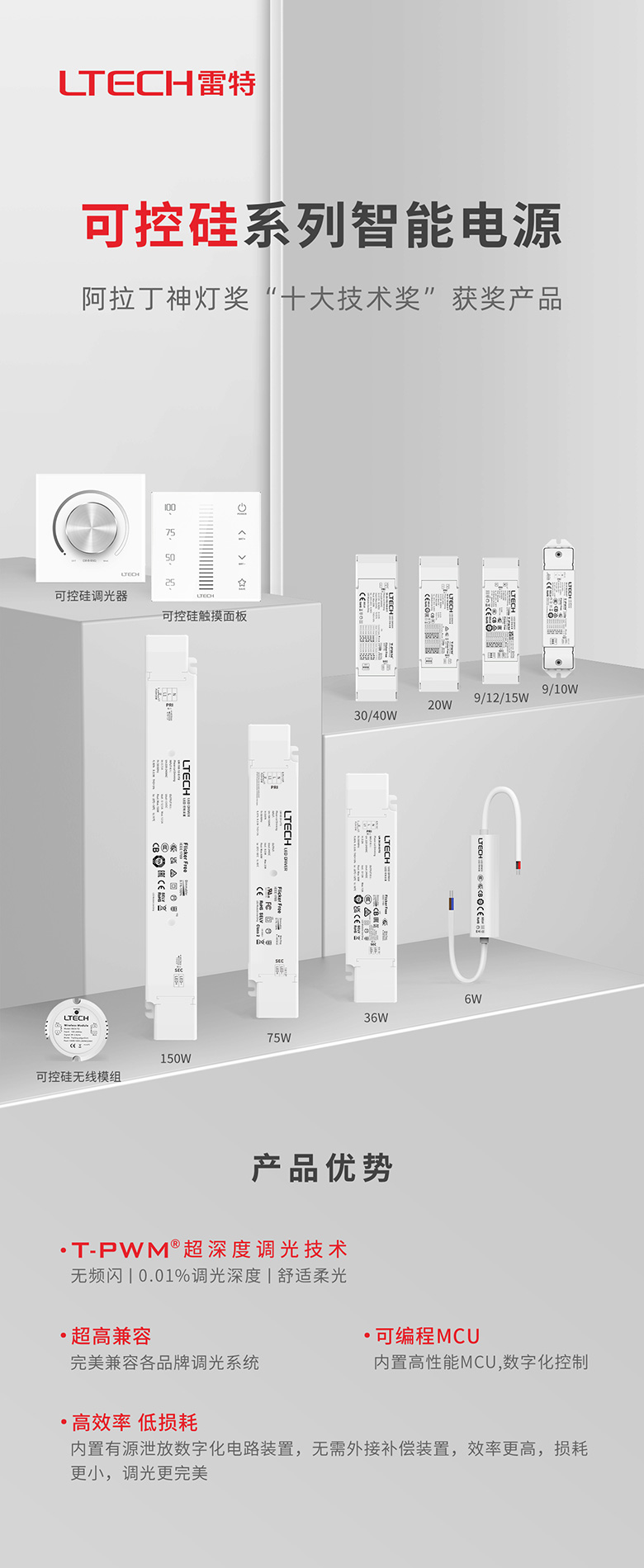 雷特可控硅电源内置有源泄放数字化电路装置,无需外接补偿装置,效率更高损耗更小,可高效落地节约成本,让调光尽善尽美,实现更为理想的照明效果。