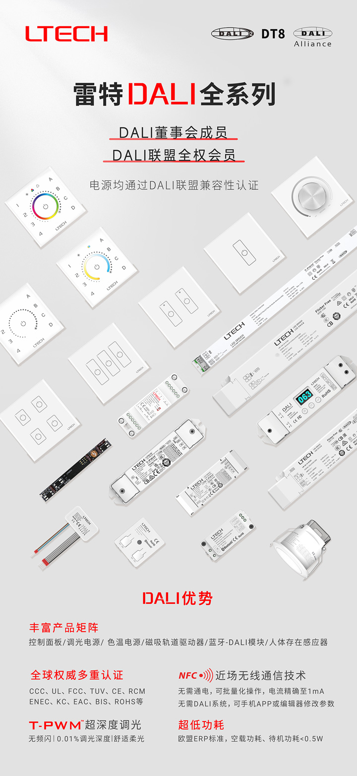 作为DALI联盟全权会员、DALI董事会成员、DALI联盟中国焦点组成员,雷特DALI产品一直严格遵循DALI联盟的协议标准,发布上市的DALI电源均通过DALI联盟认证,并获得了中国强制性CCC认证及国外UL、FCC、TUV、CE、RCM、ENEC、KC、EAC、BIS、ROSH等权威认证。