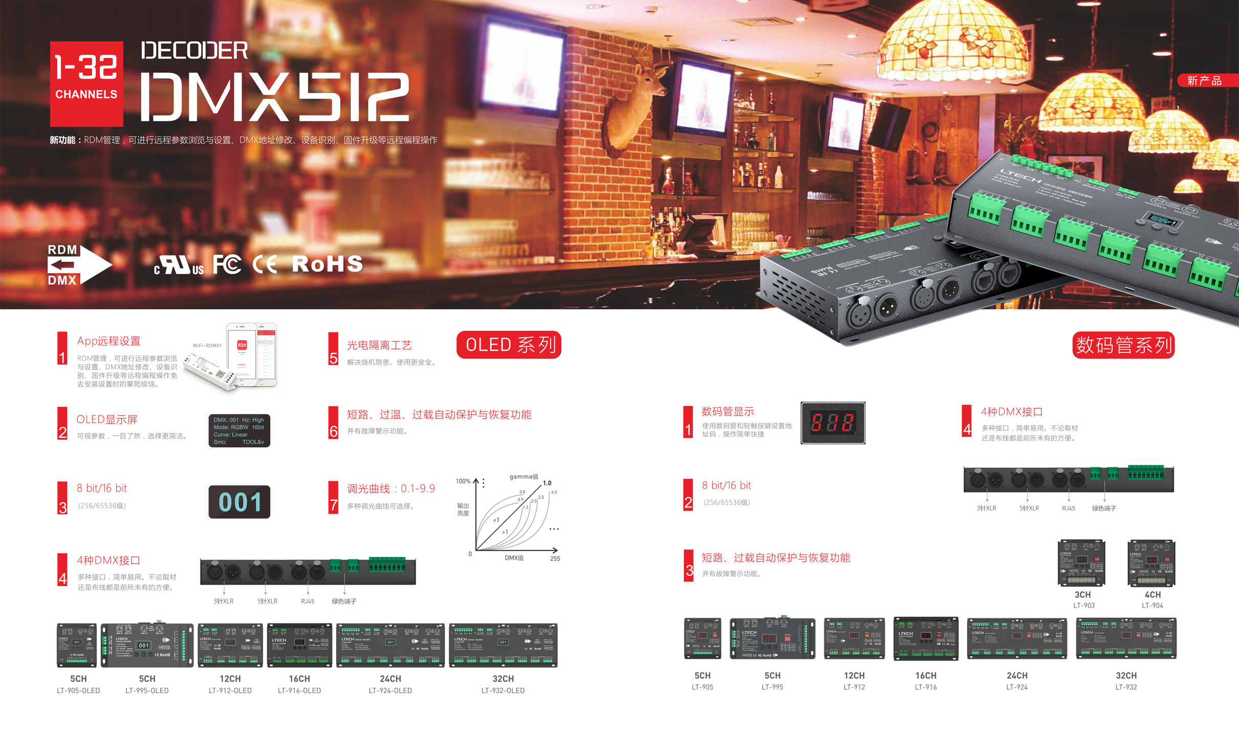 雷特DMX512解码器兼容RMD远程管理协议,支持DMX512信号双向通讯,可以实现远程读取/写入DMX地址等管理功能,安装后轻松更改地址,减轻二次作业的程序,给客户更智能的产品体验。