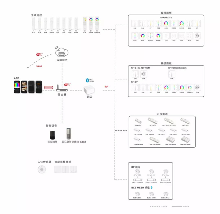 智能网关采用Wi-Fi信号和RF信号二合一控制方式,满足多种工程要求,安装操作简单便捷。同时可灵活地搭配各类LED控制器、LED驱动器、无线模组、RF中继器、蓝牙及灯具使用,无论您是简单的应用,还是复杂的工程需求,皆可满足。