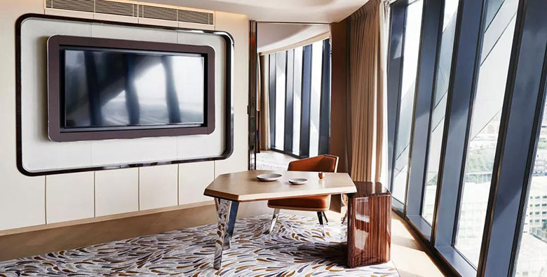 The suite furniture are designed by top designers over the world, with 58 square meters of space, providing a series of luxurious experiences, which include I-pad, automatic door in bathroom, Samsung TV, Hermes and Parma shower set, Dyson hair dryer, and so on.